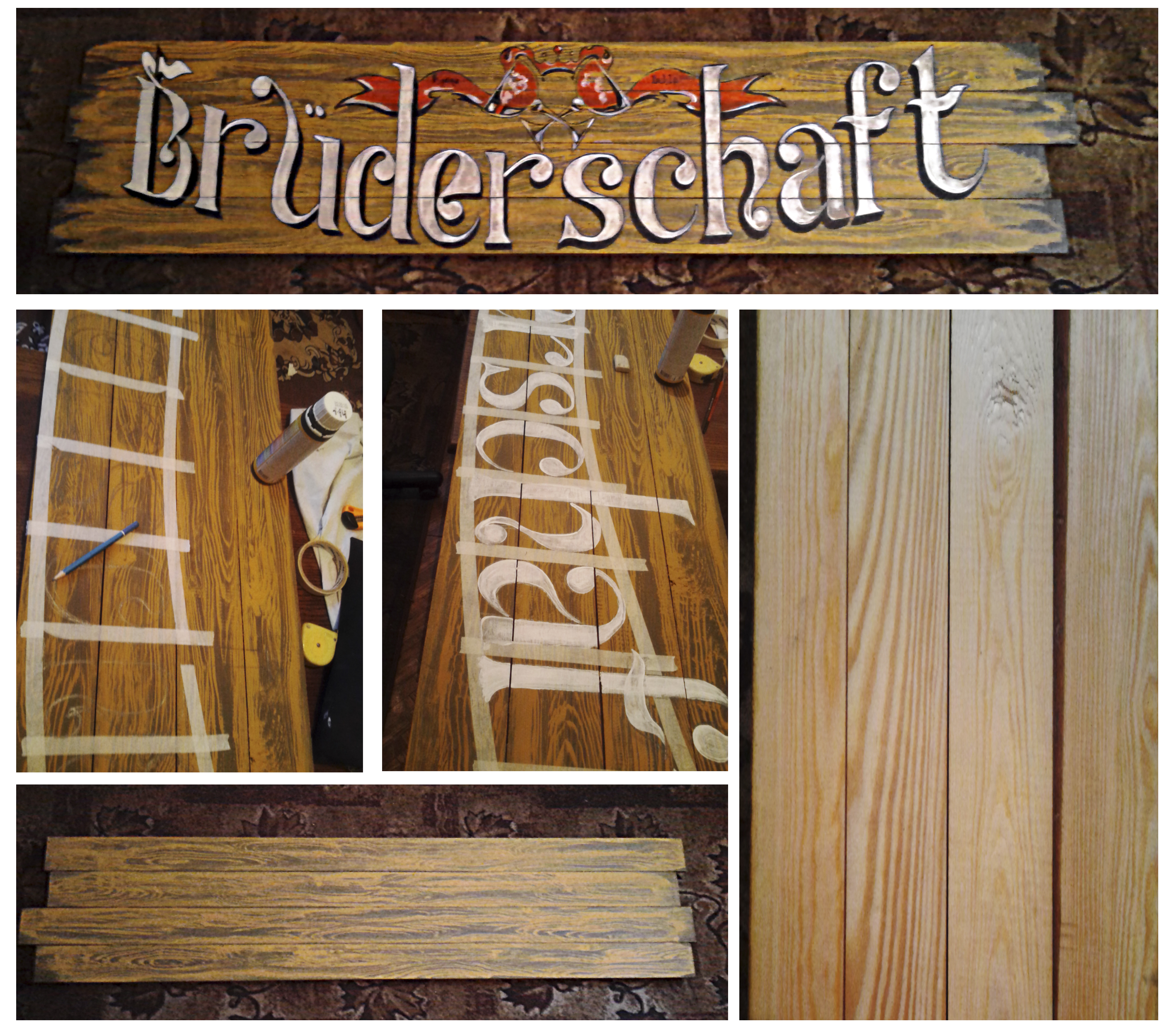 Деревянная вывеска в художественном оформлении. Размеры 180 см. на 50 см. Ниже на фото можно увидеть, что дерево — сосна, была очень светлой, а для заказа требовались цвета более контрастные в ретро стиле. Художественная вывеска изначально была грунтована для того чтобы не впитывалась краска. После были произведены обрисовки текстуры для создания старого дерева и элементы выгорания по краям. После, наносился несколько раз матовый лак для стойкости к атмосферным условиям. Эта художественная вывеска интересна тем, что выполнялась в ручную и на реальном дереве. Для создания старого эффекта доски применялась краска с определенной цветовой палитрой и это наилучший вариант для бюджетного подхода, так как выбор специальных пород дерева обошелся бы дорого. Мастерство в художественной росписи не умалило реальное восприятие, но придало вывеске гармоничный ретро антураж.