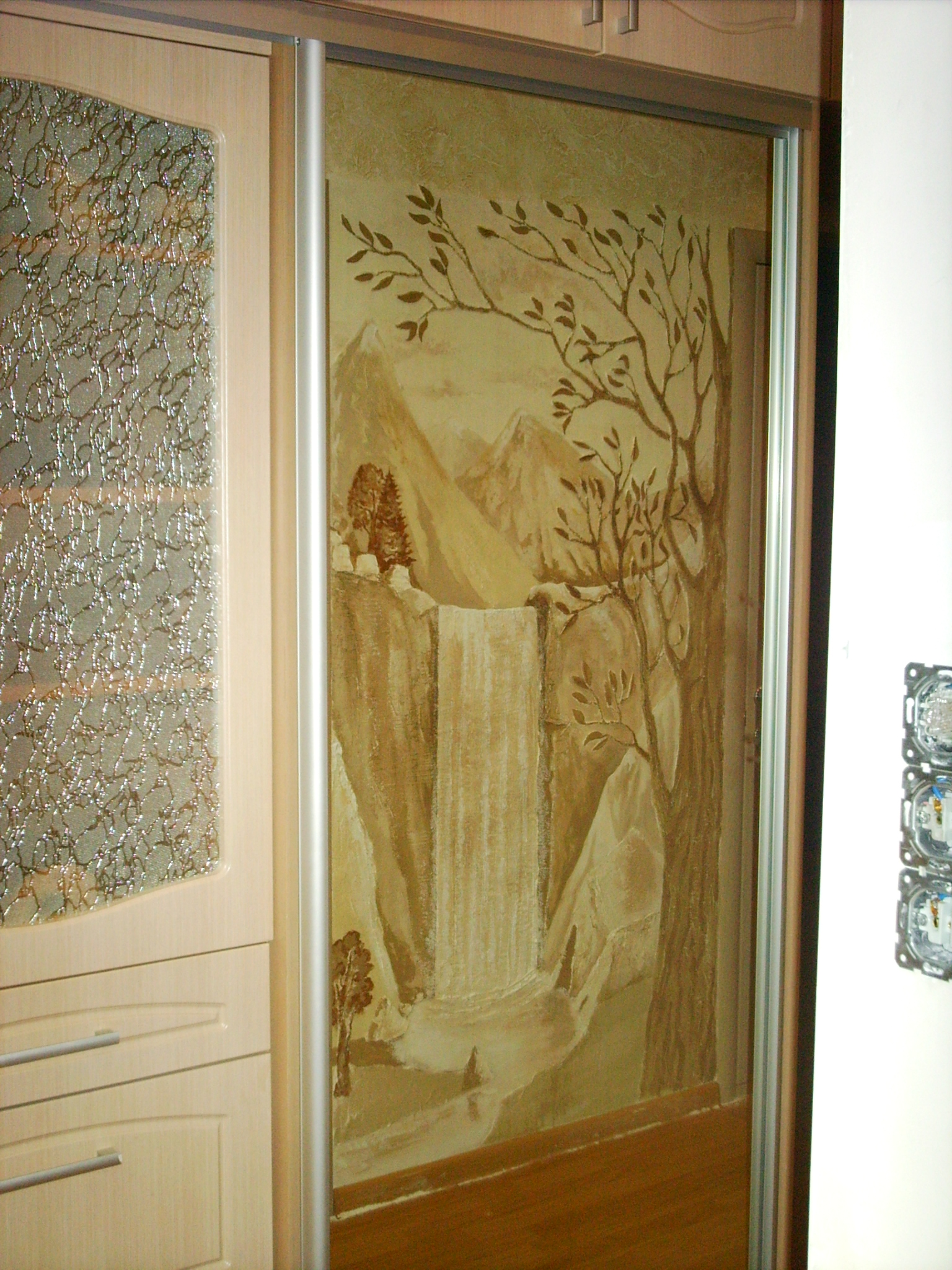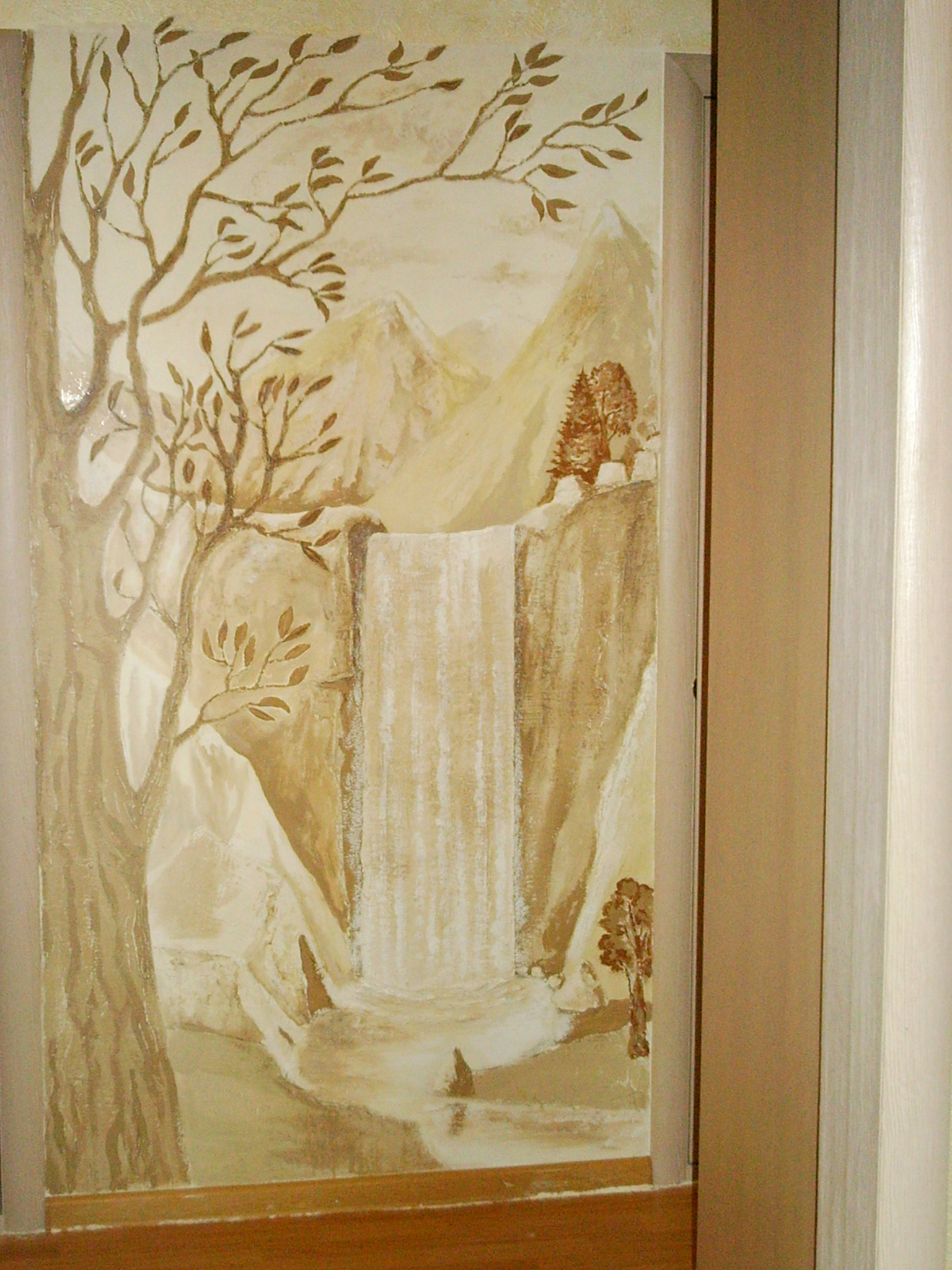 Акриловая роспись однотонными  красками с добавлением рельефной лепки первого плана. Соответствует цвету декоративной штукатурки и мебели. Размеры 1,5 х 2,5 м. Сначала гипсом по нарисованной стене создавался объем деревьев с листьями. После, заводил цвет с дальнего плана пейзажа, чтоб наверняка попасть в тон. Ближний план более темнее и четче виден, чтобы создать визуально перспективу. Чтобы показать живую природу — деревья вдали немного выражены. Работа выполнялась 4 дня.