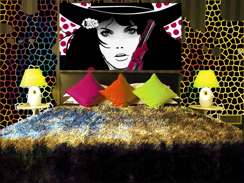 Вашему вниманию представлена спальня, которая выполнена в стиле поп-арт с картиной. Можно увидеть исходный вариант обыденного с серо-оливковыми обоями и стандартной мебелью интерьер. Заказчик хотел яркости и насыщенности красок, которые бы гармонично перекликались со всеми остальными элементами внутреннего пространства. Было принято решение поместить интерьерную картину на холсте маслом в стиле поп-арт над кроватью с контрастными белым, черным и красным оттенками. Кстати, такую картину могу нарисовать и на стене. Добавили яркие подушки, накинули на кровать покрывало из шерсти, которую подкрасили под насыщенные цвета и я обработал участки стены светоотражательными красками с игрой разных тонов. В конечном итоге получилась вот такая художественная роспись стены. По всем вопросам обращайтесь через контакты на странице: Контакты и Цены