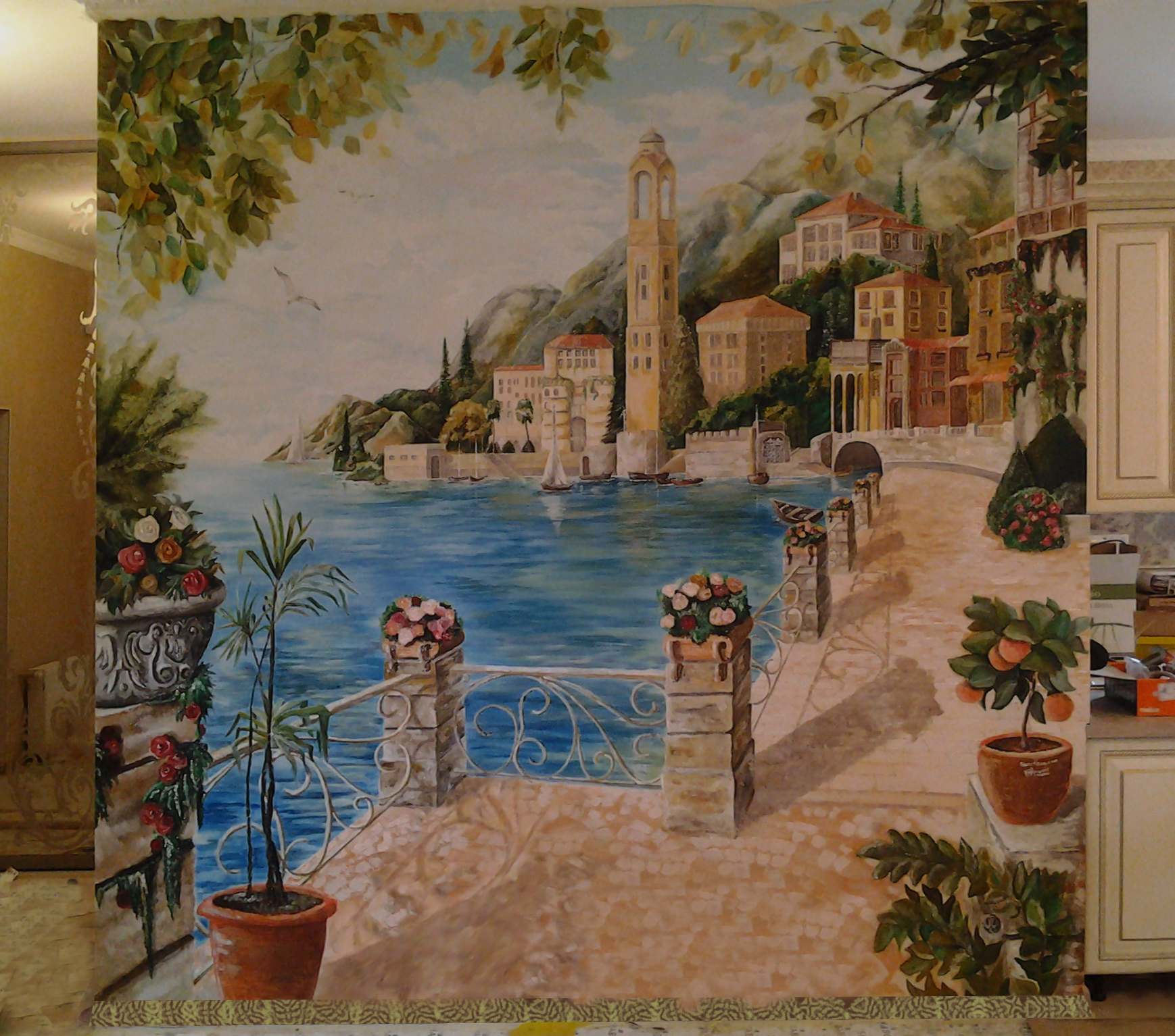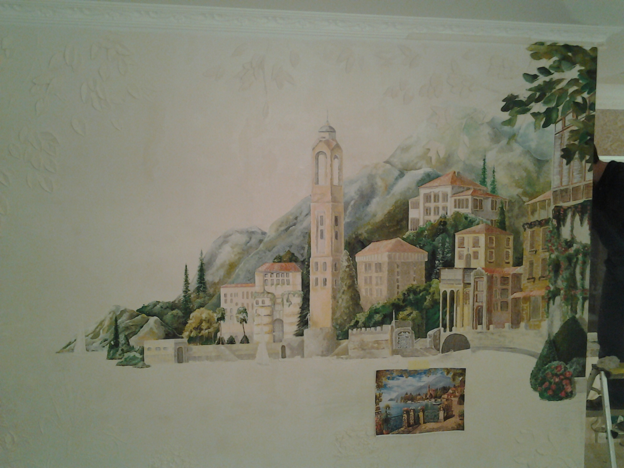 Итальянский пейзаж еще в моде интерьерных росписей. Художественная отделка гипсовым барельефом придает рисунку эффект объемного изображения. Данная картина была написана в прихожей на стене соединяющей зал с лестницей на второй этаж и коридором идущим на кухню студию. Картина выполнена в стиле интерьера с использованием красок характерных тонов внутреннего пространства. На месте был изменен эскиз под площадь художественной росписи на стене. Все детали обговариваются и корректируются при необходимости в процессе работы по желанию заказчика. То есть — возможно все. По окончанию все остаются довольны — это мой принцип!!! Обращайтесь через контакты на странице: КОНТАКТЫ И ЦЕНЫ