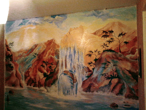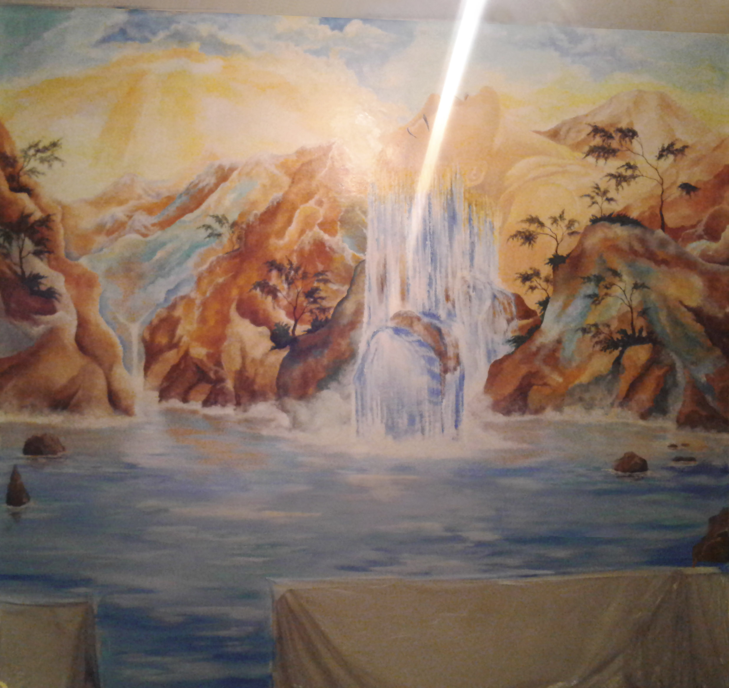 Художественная роспись ванной комнаты с характерными тонами внутреннего интерьера. Стены обклеены пробкой цвета «махагон», который был повторен на картине и имеет градацию от светлого до темного тона в горах. Ниспадающие водопадом волосы девушки успокаивает и визуально расслабляет зрителя. Роспись расположена над ванной и на рисунке плоскость воды идет до краев ванны, что создает впечатление погруженности в водную стихию горного пейзажа. Принимая во внимание, что рисунок будет в последствии подвержен определенным тепловым и водным воздействиям, была тщательным образом подготовлена основа, прогрунтована поверхность для нанесения художественной росписи и в последствии производилось вскрытие устойчивым лаком в несколько слоев по определенной технологии. Роспись открывает пространство помещения и позитивно влияет на настроение. Ведь если даже не учитывать художественных пристрастий каждого индивидуума, в любом случае искусство, в данном случае художественное, облагораживает человека как минимум эстетически и максимум аксиологически.