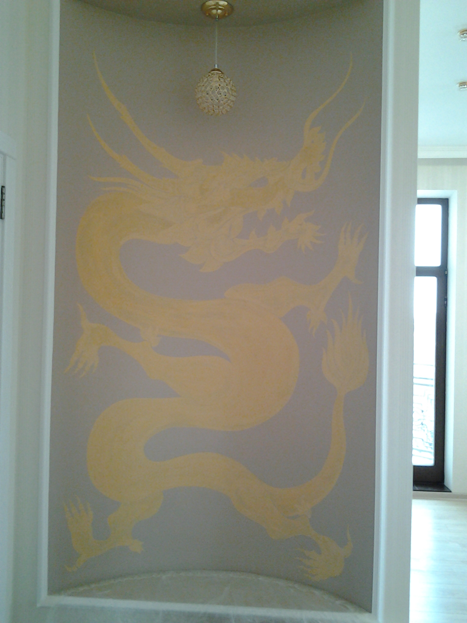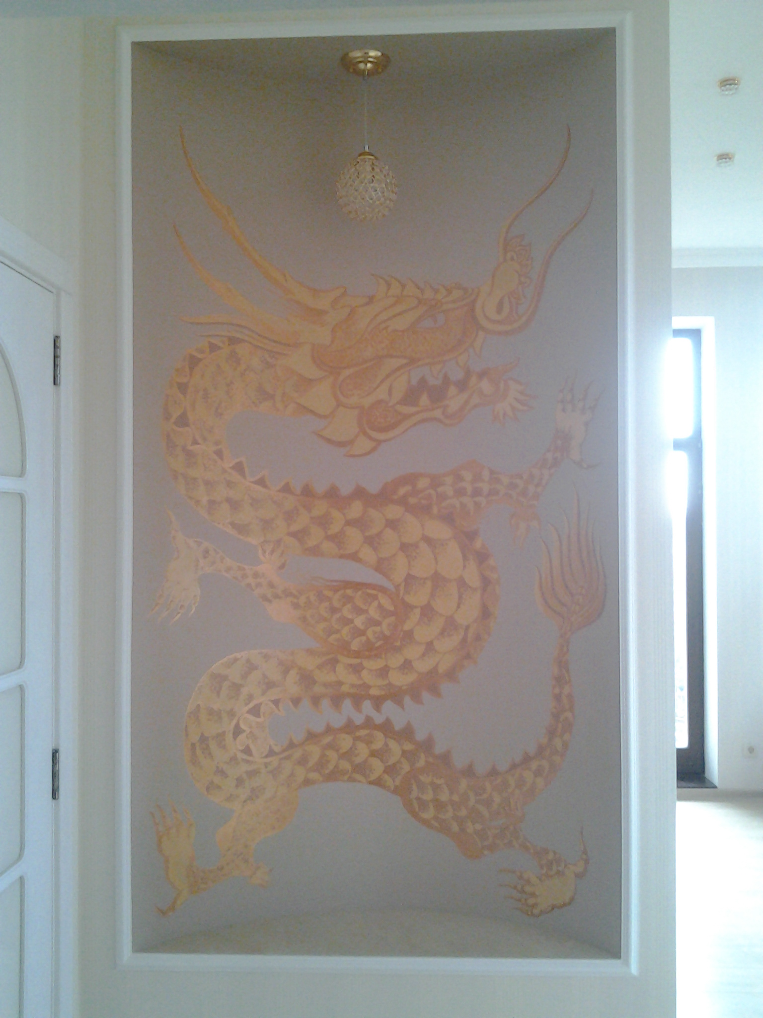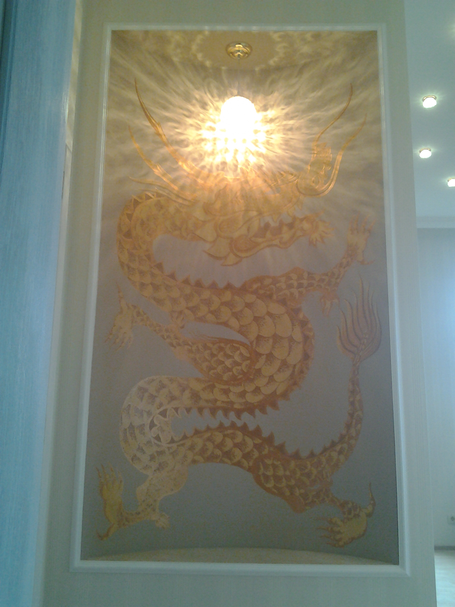 Имитация национального символа доброй стихии. Цветовая гамма была выполнена под оттенки интерьера для привязки и гармоничной поддержки. Бронзовая краска через отражение света делает рисунок ненавязчивым и мягким для легкого восприятия. Художественная роспись выполнена стилистически аналогичным методом оригинальных китайских рисунков с изображением дракона. Роспись дает отсыл к восточной культуре понятными изобразительными формами. Размеры 2.20 х 1.45 с изгибом.