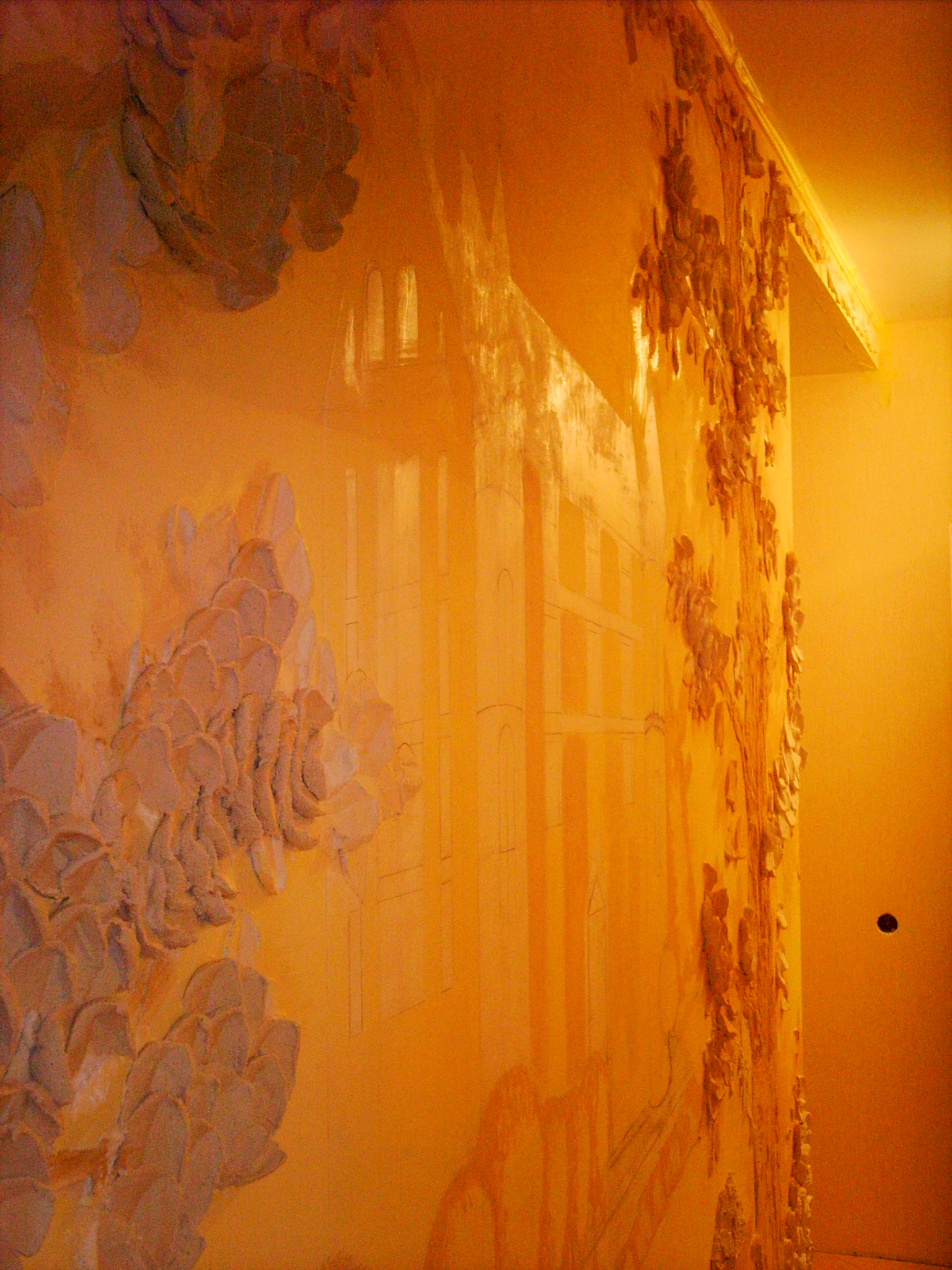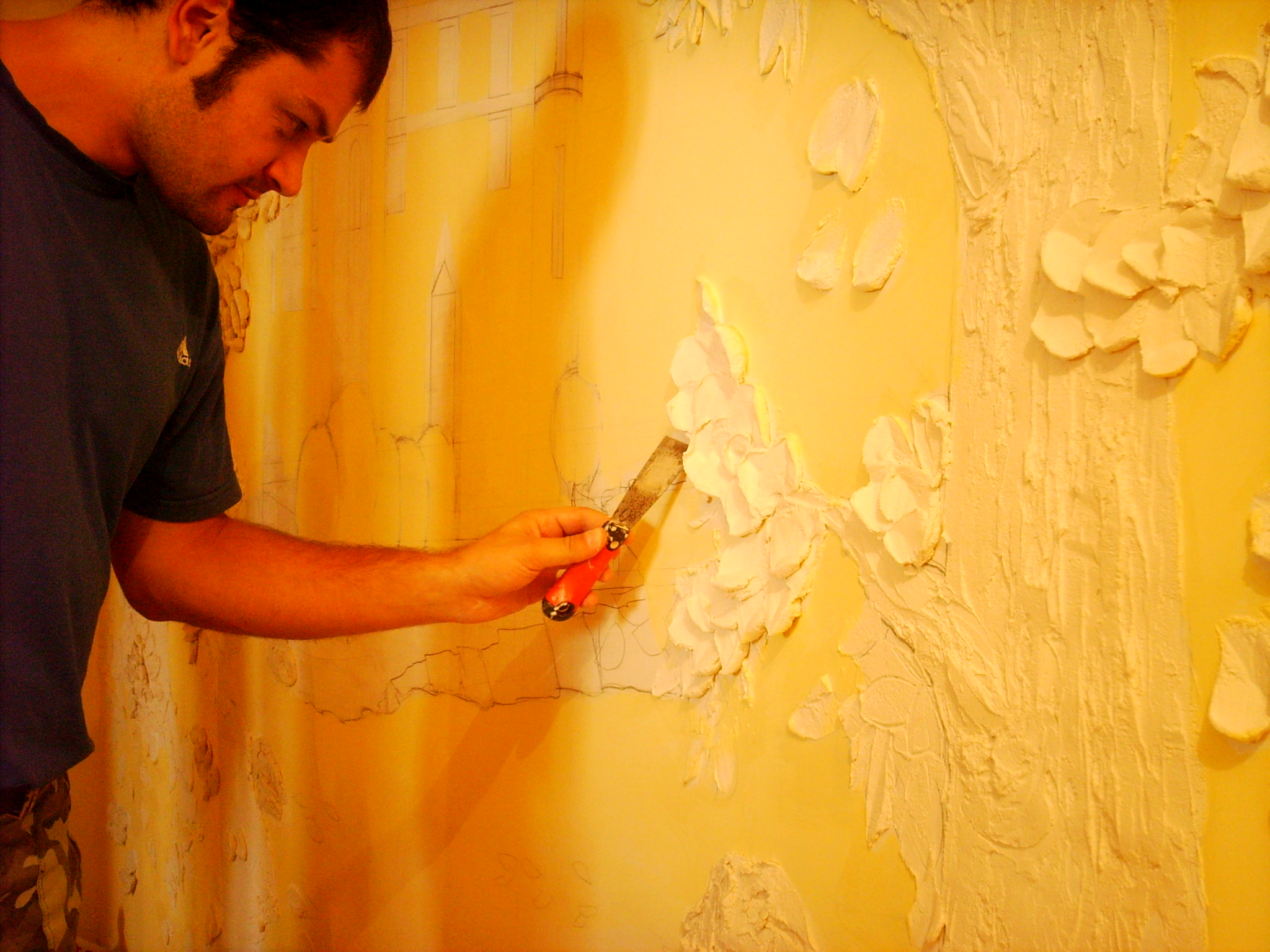 Роспись стены в Одессе акрилом с элементами лепки. размеры 8 кв.м. Первый план деревьев и камней сделан барельефом из гипса. второй план замка прописан кистью. Песочные тона подобраны под стиль интерьера. Создает мягкий и сказочный фон пространства. Каждый заказ — индивидуальный подход к пожеланиям заказчика. Консультирование производится на объекте, потом подбираются соответствующие эскизы, которые могут быть доработаны редакцией художника по необходимости прямо на месте.