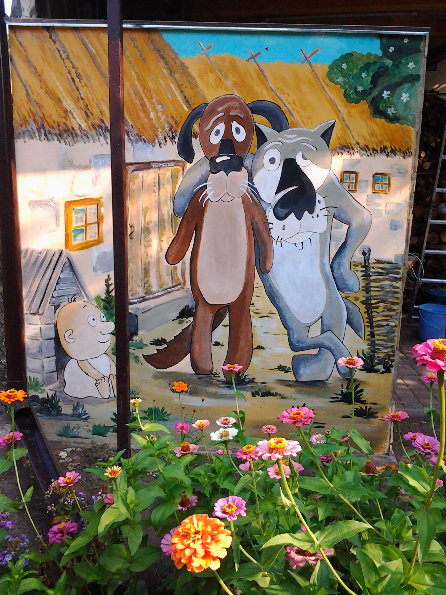 Рисунок на фасаде стены барбекю, занимает всю ее площадь во внутреннем дворе частного дома.  Стена небольшая по площади и составляет примерно 5 кв.м. + она выходит в огород и хорошо просматривается со входа на участок. Интересное художественное решение по желанию заказчика полностью удовлетворило его. Создав эйфорию яркого украинского хутора с целым калейдоскопом национальных типажей и их особенностей, этот запоминающийся мультфильм и был положен в основу росписи стены. Два главных персонажа и по сей момент несут личностный энергетический заряд и тем самым наполняют пространство эмоций новыми красками. Композиция получилась больше комедийной нежели драматичной, так как в ней присутствует маленький ребенок, который разряжает взрослую философски острую бытовую обстановку  и делает это легко и непринужденно.
