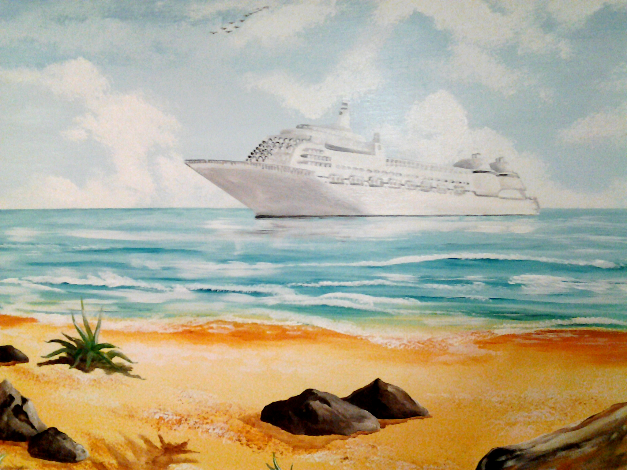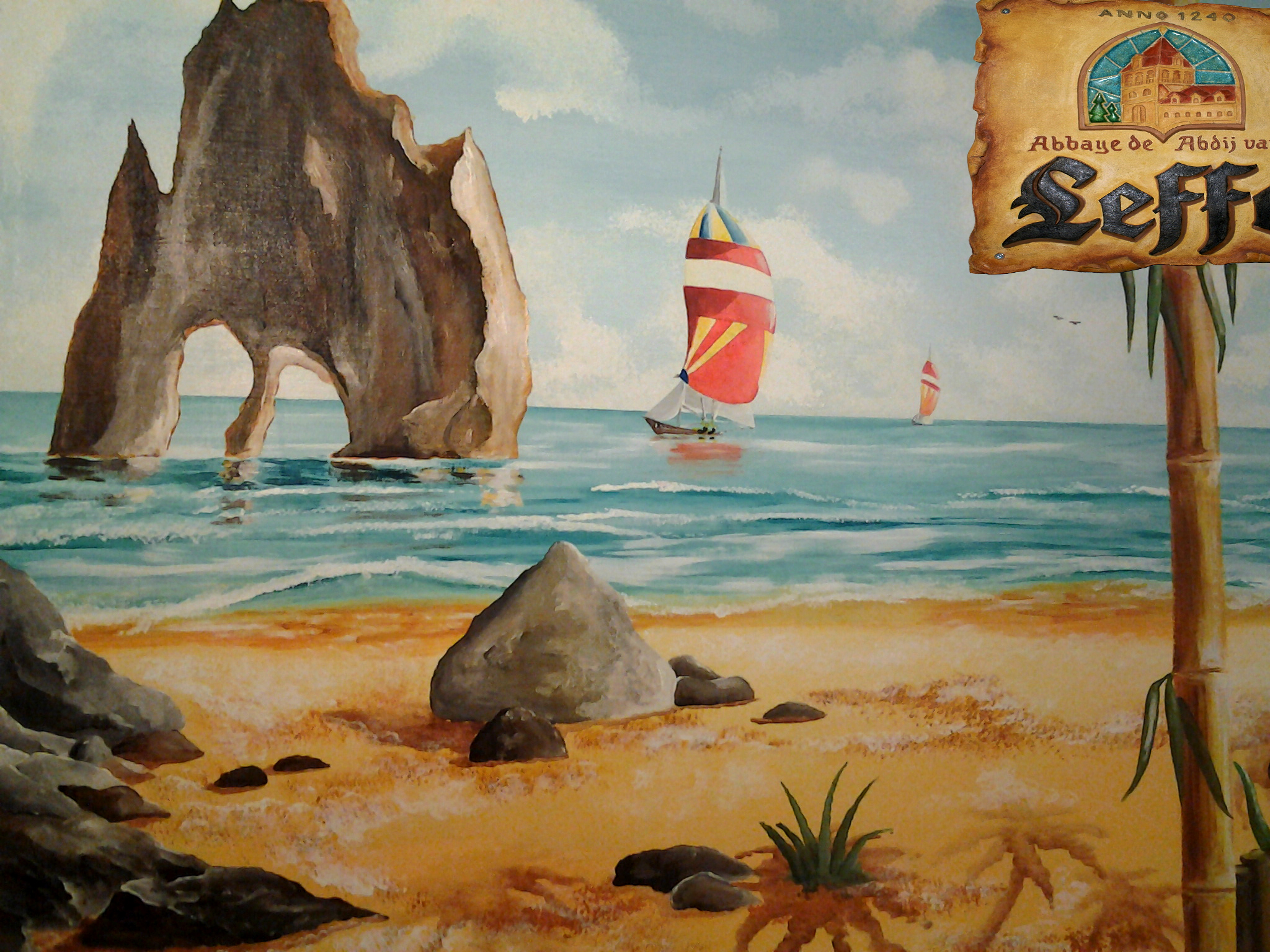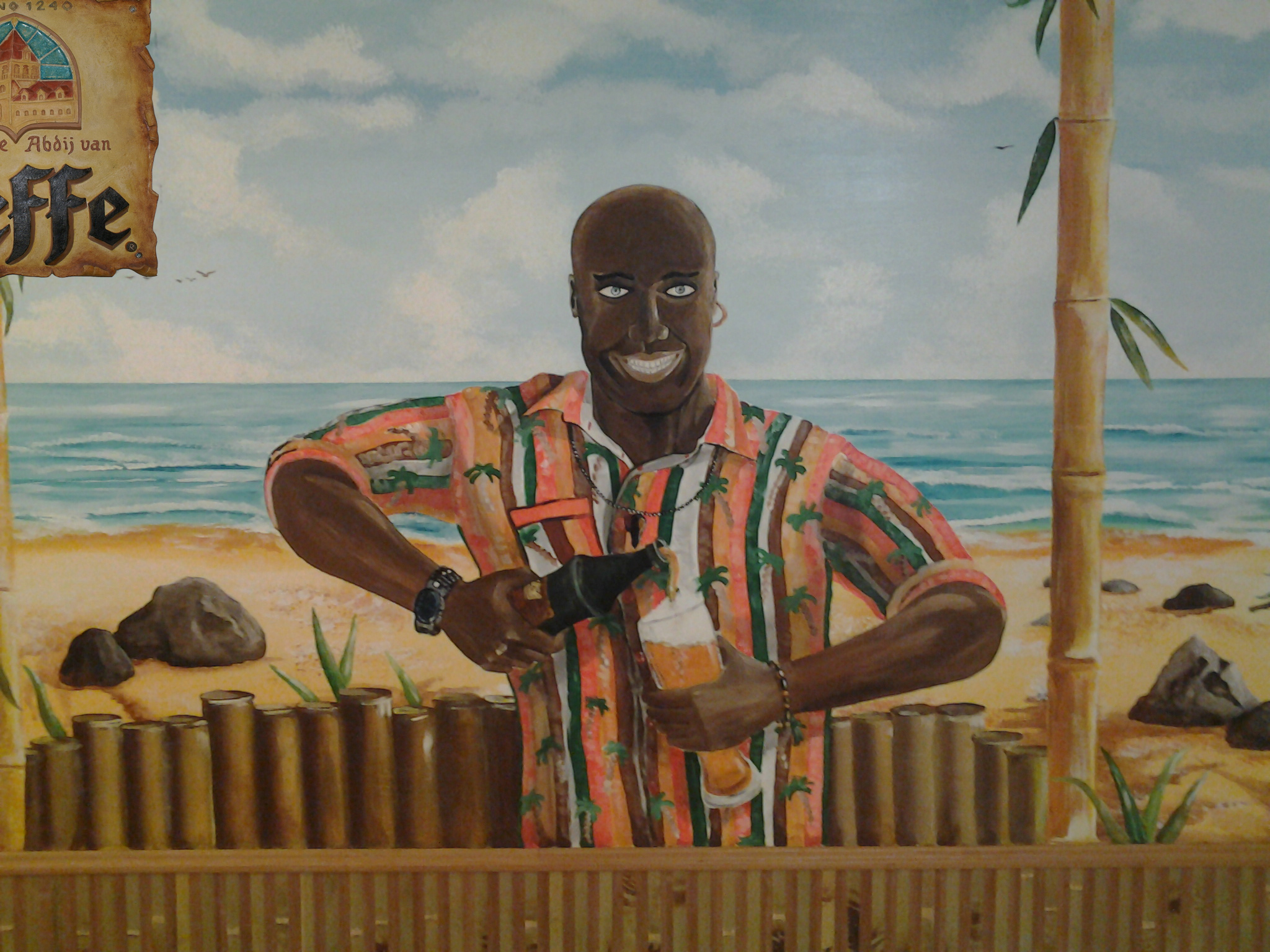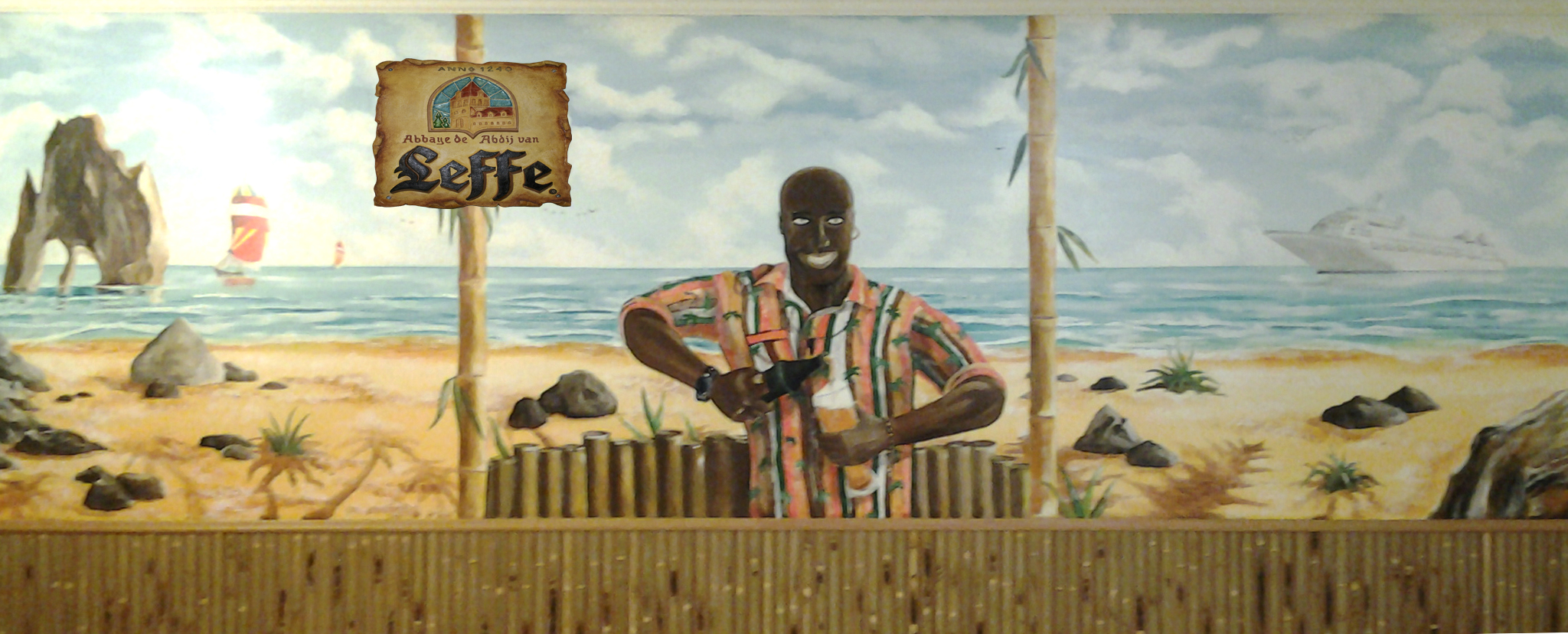 Роспись стены загородного дома в сауне придает своей экзотикой позитивную и легкую атмосферу отдыхающим. Черный бармен с бокалом пива является центральной фигурой стенной росписи. Декорация картины плавно комбинируются с элементами интерьера. Все художественные составляющие соответствуют характеру и стилю внутреннего пространства помещения сауны, поддерживают основной фон и выражают с большей ясностью и красотой концепцию отдыха и удовлетворения. В данном случае «активная декорация»- искусственные листья с деревьями и соломенный навес, осталась за заказчиком, чтоб произвести полную иллюзию места. Фон в картине не совсем дикий, так как разбавлен парусниками и лайнером на заднем плане, что создает образ богатой культурной платформы всего пейзажа. Первый план фигуративной живописи устремлен непосредственно на зрителя вызывая его на «диалог» и как бы приглашая к взаимосвязи. Человек дружелюбно смотрящий на зрителя с улыбкой, наливая бокал пива мимически, исходя из своей физиогномики идет на сближение. Зритель невольно оказывается вовлечен во всю картину изображенного, оживляя ее своей фантазией как сознательно так и и бессознательно. А по большому счету, картинка интересна как минимум смешным сюжетом )